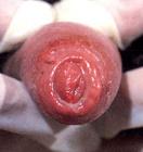 2.念珠菌性龟头包皮炎 多在免疫力低下和使用广谱抗生素的情况下发生。阴茎头和包皮瘙痒、疼痛,局部充血水肿,有小水疱和糜烂,表面附有白色斑片和奶酪样物。分泌物镜检和培养有白色念珠球菌。