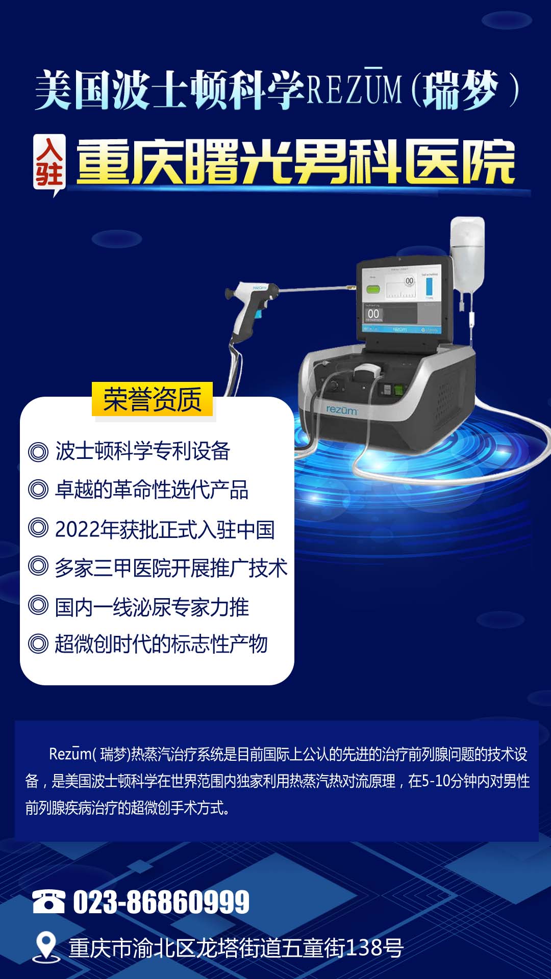 重庆曙光男科医院是重庆市首一个使用美国波士顿科学瑞梦前列腺热蒸汽技术的医院,5-10分钟搞定前列腺疾病。在全球50岁以上男性中,超过一半患有前列腺增生症,80岁以上男性患病比例高达90%。前列腺增生会造成堵塞尿道,带来尿频、尿急和尿潴留等问题,情况严重的还会造成肾损伤。目前临床常用的外科手术或激光手术,均是通过破坏前列腺增生的结构来达到治疗目的,一台手术通常需要2-3小时。而美国瑞梦治疗系统开创的"超微创"技术,是利用高温水蒸汽的热能释放使前列腺增生的组织细胞瞬间坏死,并被人体自然吸收,从而缩小前列腺体积,改善排尿困难等症状,且术后可以良好保留患者的性功能。其平均手术时间仅5-10分钟,只需局部麻醉即可完成,极大地减轻了前列腺患者的疾病负担。
