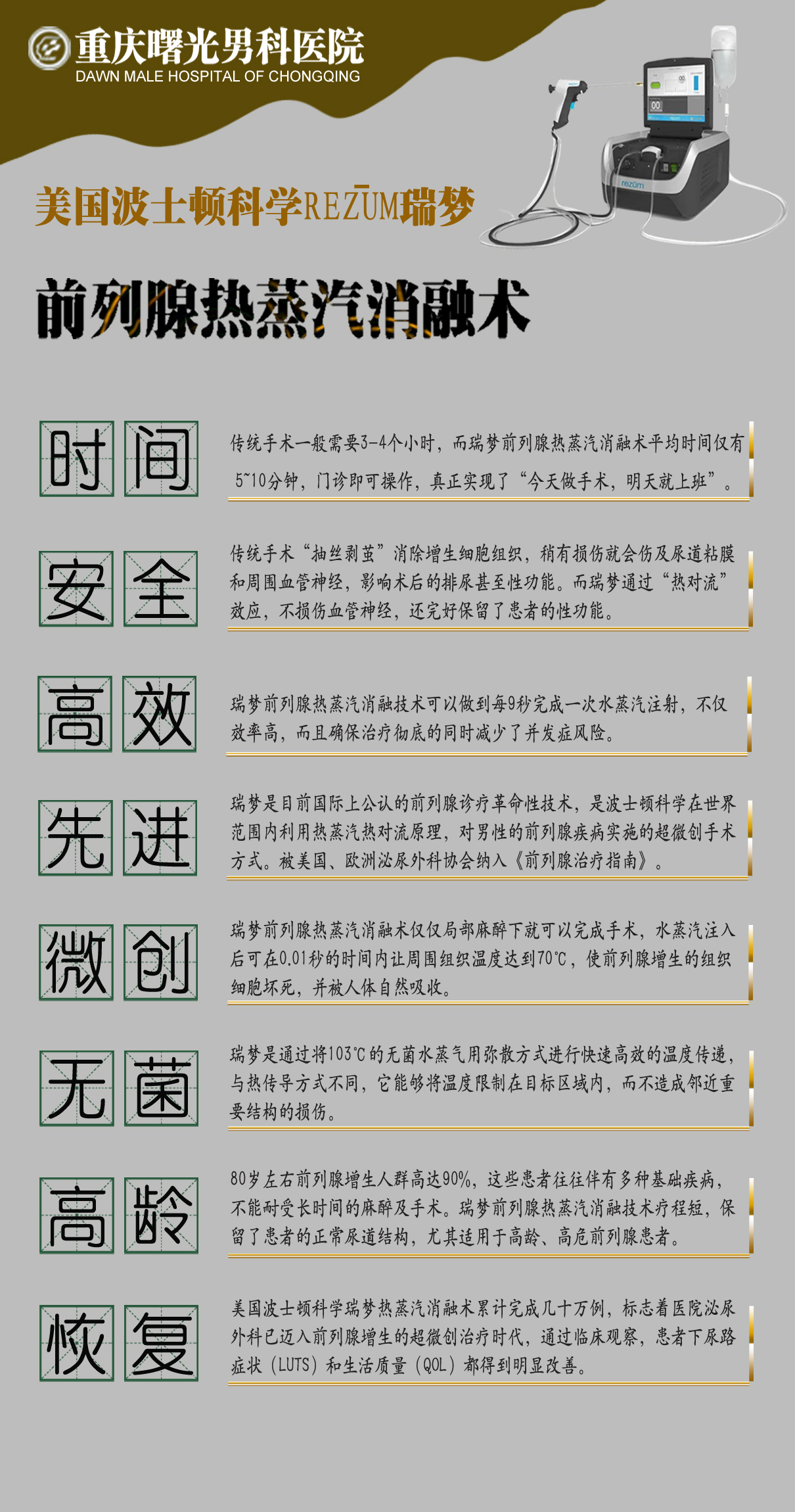 重庆瑞梦前列腺男科医院-排名消息一览发布-重庆曙光男科医院推荐-热蒸汽消融术治疗前列腺增生!1、重庆曙光男科医院官网2、重庆曙光男科医院口碑3、重庆曙光男科医院地址4、重庆曙光男科医院男科。男性的前列腺会一直长大,从青春期开始在雄激素的帮助下会持续长大,人老了,它还在长。所以,前列腺增生是每个男性都逃不过的问题,随着年龄增长发病率越高。