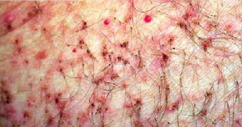 B、皮疹:在阴虱叮咬处常有微孔(肉眼看不见),局部发红,有小红斑点,其上有血痂;微孔处约经5天,局部产生过敏反应,常隆起出现丘疹。因搔抓常出现感染,见脓疱、渗液、结痂。