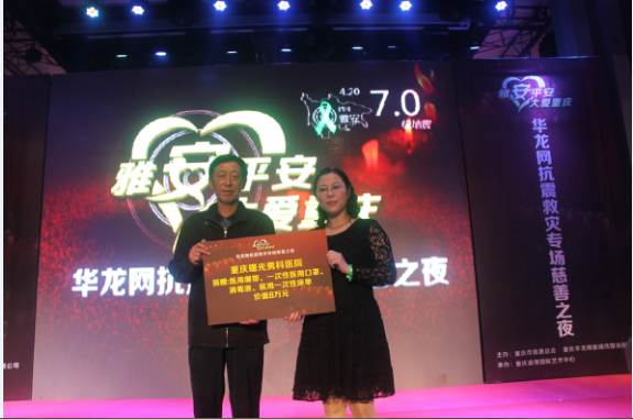 在重庆市文化宫举办的盛大慈善晚会上,近二十家家企业及近百名社会各界名流均以不同的形式传递对雅安灾区人民的爱心,重庆曙光男科医院因再次捐赠大批医用物资,受到各界人士的高度好评。