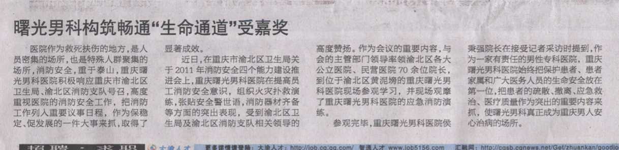 近日,在重庆市渝北区卫生局关于2011年消防安心四个能力建设推进会上,重庆曙光男科医院在提高员工消防安心意识,组织火灾扑救演练,张贴安心警世语,消防器材齐备等方面的突出表现,受到渝北区卫生局纪委书记刘雪梅及渝北区消防支队谢鹏参谋的高度赞扬。作为会议的重要内容,与会的主管部门领导率领渝北区各大公立医院、民营医院70余位院长,到位于渝北区黄泥磅的重庆曙光男科医院现场参观学习,并现场观摩了重庆曙光男科医院的应急消防演练。