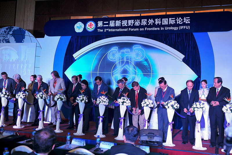 本届论坛开幕式开始前,组委会特别安排了吴阶平院士的纪念仪式---小提琴演奏着深情的协奏曲《思念》伴以回顾吴老人生主要画面的VIDEO和舞台上以白色玫瑰、天堂鸟、勿忘我和紫色缎带组成的花球,由表演艺术家冯福生先生声情并茂地朗诵诗歌《思念》,让参会医生充分表达了对吴老的思念之情和敬仰之心。随后,开幕式由本届论坛主席之一、CUA候任主任委员孙颖浩教授主持。本届论坛主席之一、CUA前任主任委员、吴阶平基金会泌尿外科学部理事长那彦群教授为大会致辞;CUA主任委员叶章群教授代表CUA致辞;吴阶平医学基金会理事长晓萌女士代表基金会致辞。接着,孙颖浩教授邀请到会的CUA顾问孙则禹教授、副主任委员孙光教授、黄健教授、孔垂泽教授、晓萌女士、AUA候任主席Sogani教授、EAU学术委员会委员Bangma教授、泌尿外科学会行业内事务办公室主任Mario Sung教授、日本泌尿外科学会教育委员会委员赤座英之教授与论坛三位主席那彦群教授、叶章群教授和孙颖浩教授一起剪彩并宣布论坛开幕。